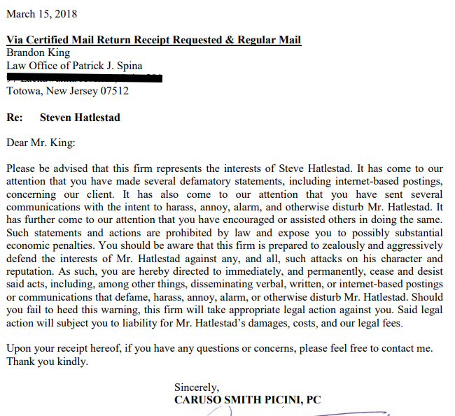 Another Cease and Desist letter was recently delivered to the law office of Patrick J Spina in New Jersey.
