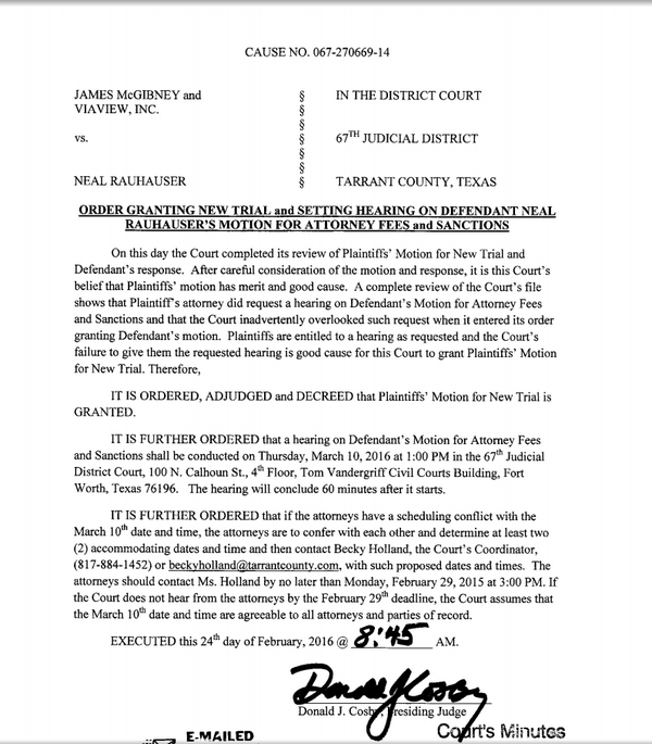 Judge Cosby has granted Viaview’s motion for a new trial. This was unexpected but the judge agreed he had overlooked ViaView’s request for an oral hearing.