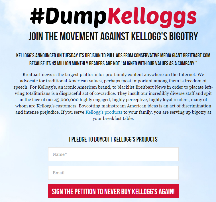 Breitbart News, which transformed itself from a creepy far right blog into a CREEPY CONSERVATIVE MEDIA GIANT is retaliating against Kelloggs by getting their readers to sign a petition (? a petition?) to boycott Kelloggs. Breitbart is also posting negative articles attacking Kelloggs.