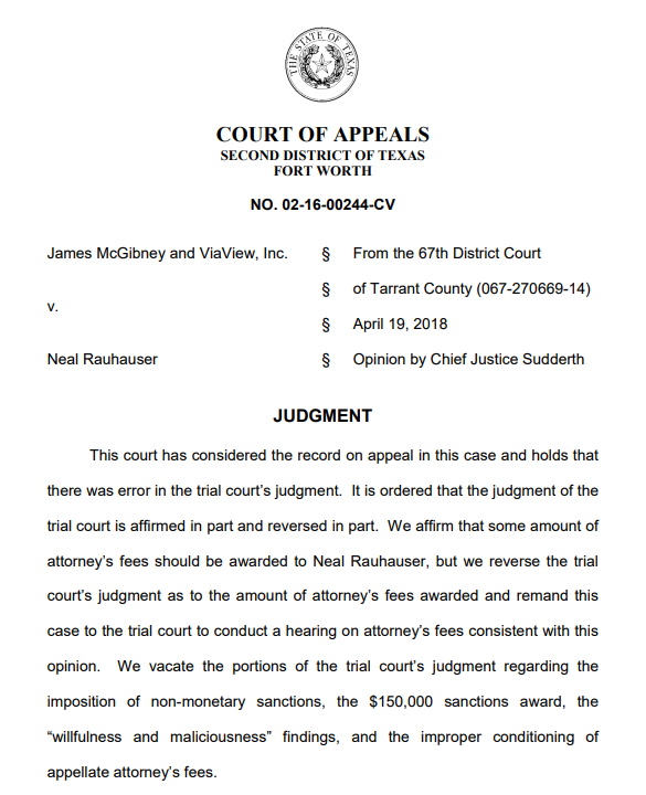 You can see the short version below but what this means is that although Rauhauser won the lawsuit, the monetary and non-monetary sanctions against McGibney have been overturned.