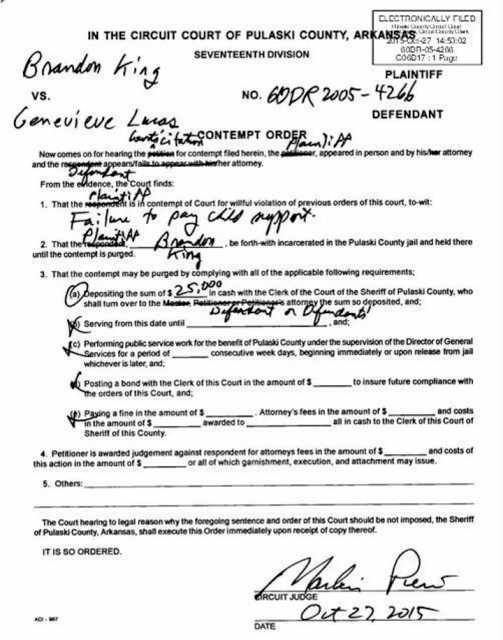 In October of 2015 Brandon King was cited for contempt of court for not paying his child support. He was $25,000 behind.