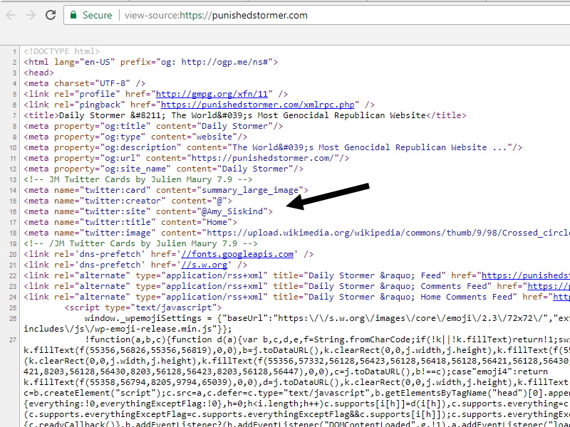 When you add the Twitter Card script to your blog there’s a few places to enter your twitter account name as content tweeter, owner of the blog or writer of the post. In the case of Punished Stormer, they’re using Amy Siskind’s twitter account. Stormer is suspended from Twitter but had to use somebody’s name in the code