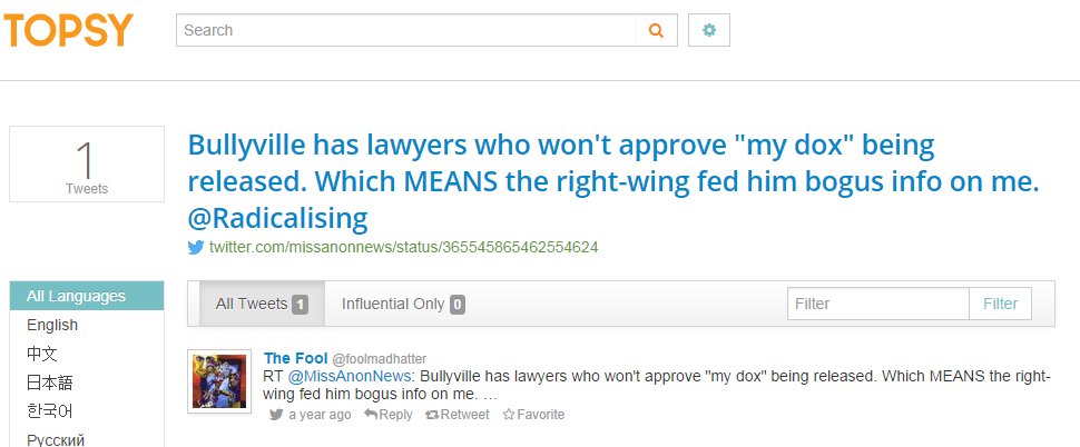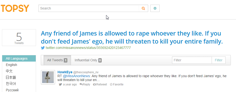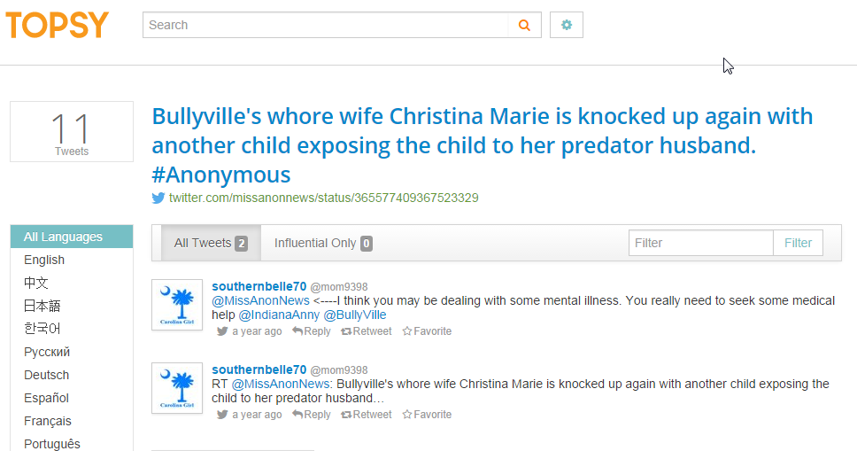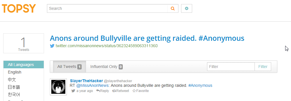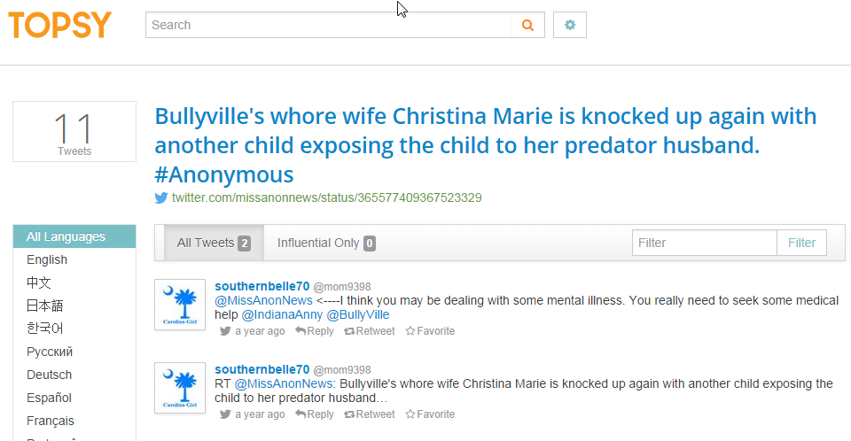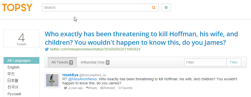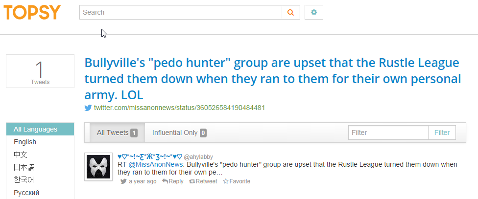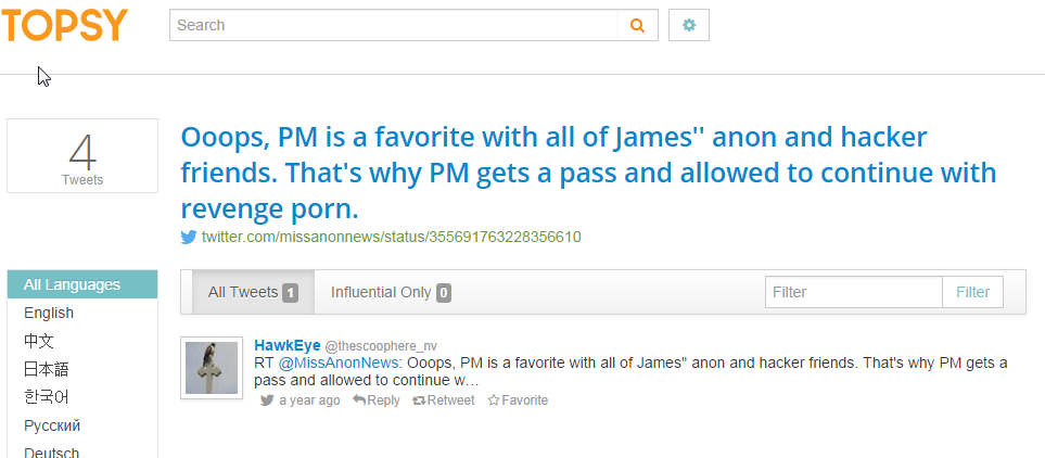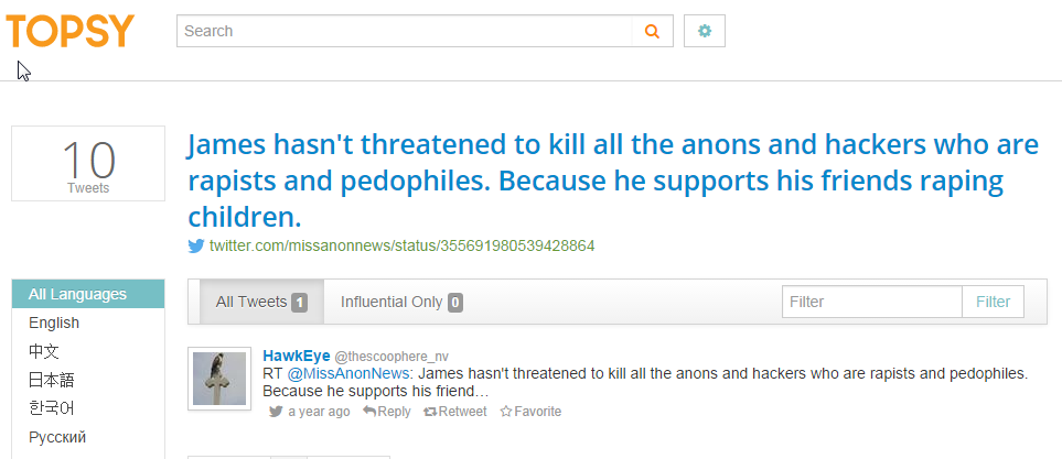 It’s believed that MissAnonNews was a group account operated by Neal Rauhauser and friends. The following tweets from Topsy are no longer available due to the account being suspended.