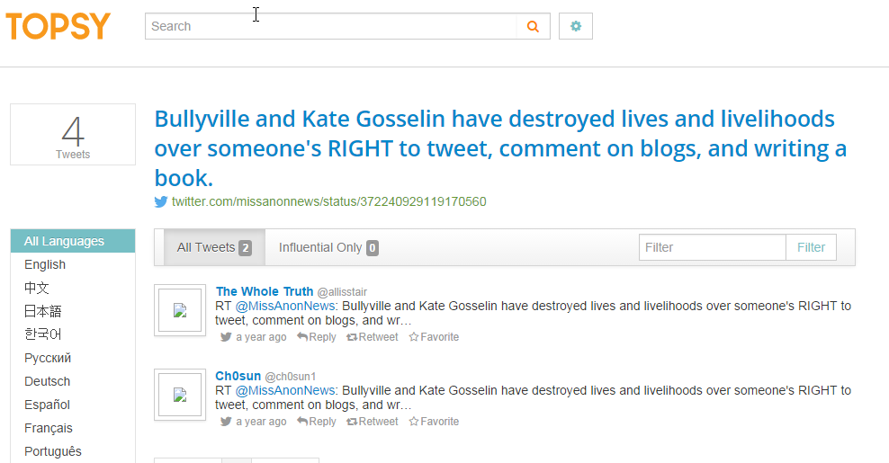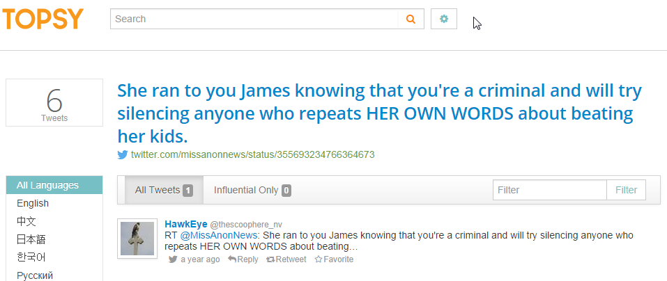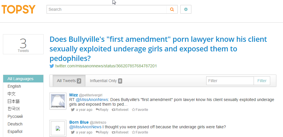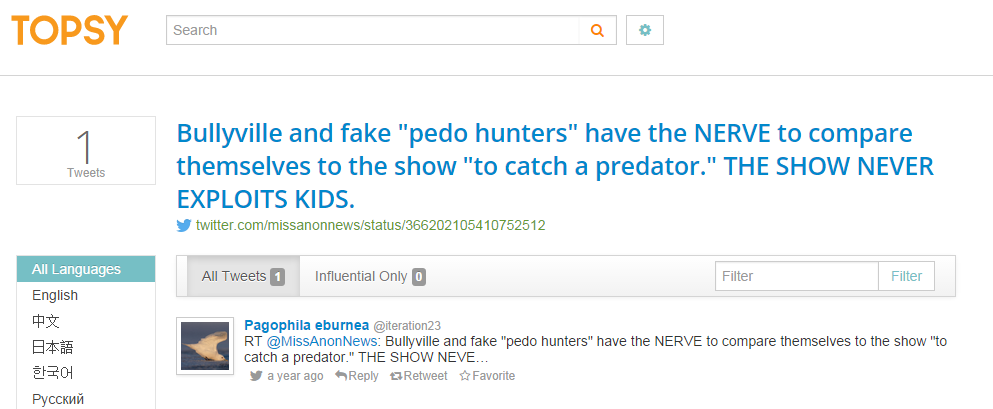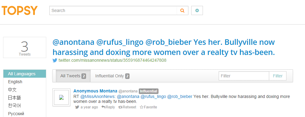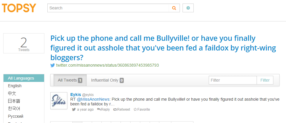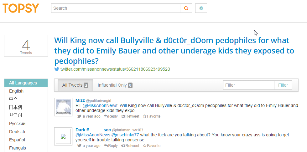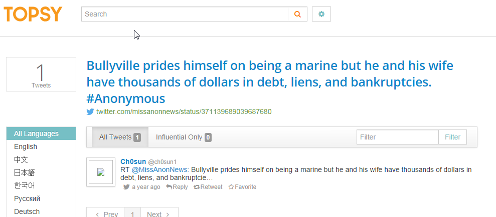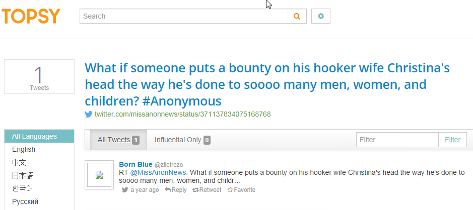 It’s believed that MissAnonNews was a group account operated by Neal Rauhauser and friends. The following tweets from Topsy are no longer available due to the account being suspended.