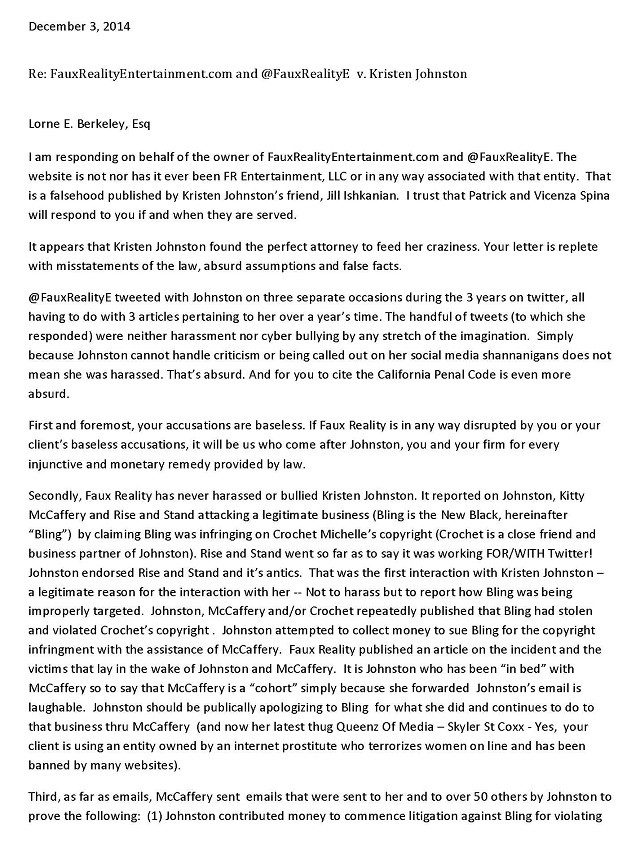 Kristen used an attorney to ask Vinnie to cease and desist harassment and defamation. Vinnie, who was a lawyer until she was disbarred in 2008, replied with a snotty letter on December 3rd. Here’s the first page.