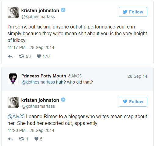 The tweets below are from September 28th, 2014 where Kjo comments about Leeann Rimes having a blogger removed from one of her concerts.