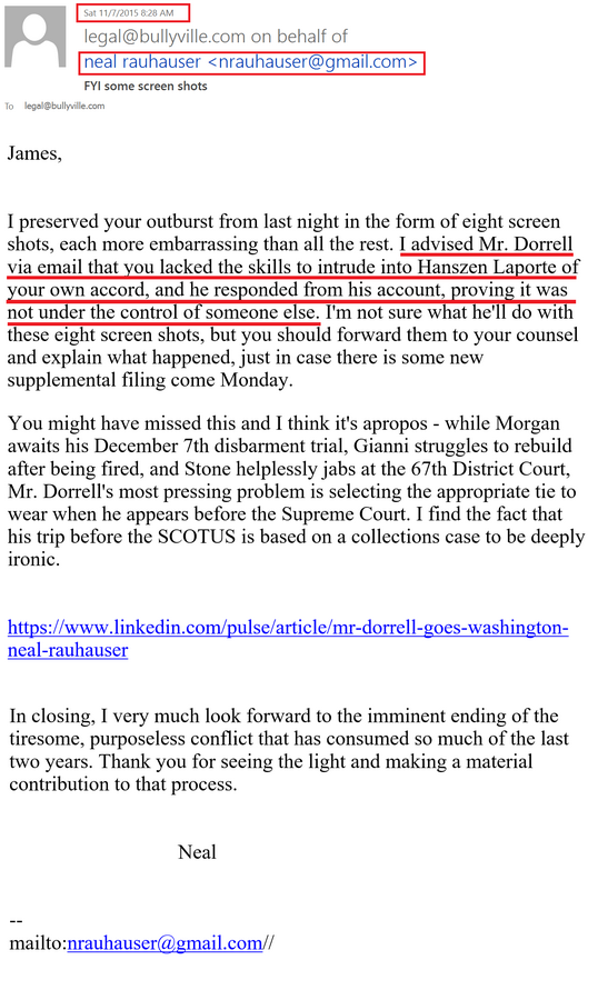 One of the allegations made by Rauhauser’s lawyer, Jeffrey Dorrell, is that James McGibney hacked into the network of his lawfirm, Hanszen Haporte, and put child porn on the computers. In the first email below, you see that even Rauhauser himself disputes this.