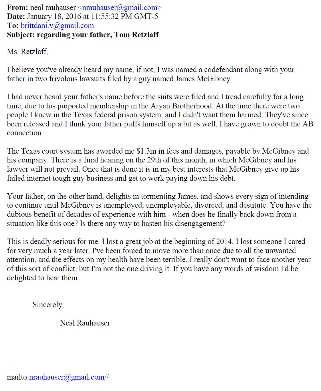 The second email is also from Neal and was sent to Tom Retzlaff’s daughter. Displaying once again his amazing Narcissistic Personality Disorder, Neal has the balls to ask Retzlaff’s daughter when she thinks Retzlaff will quit harassing McGibney.