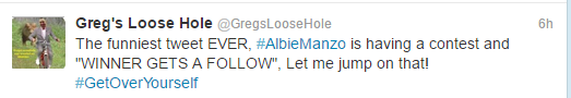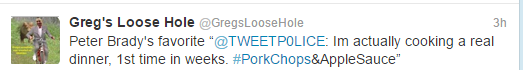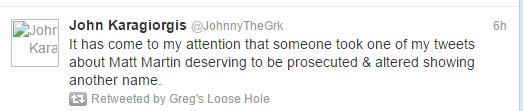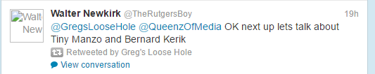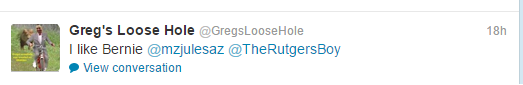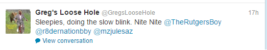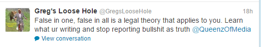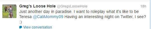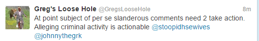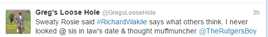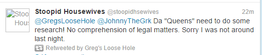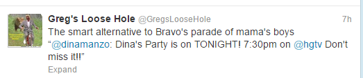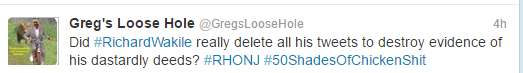 The Twitter account name Greg’s Loose Hole refers to Greg Bennett, a member of the Real Housewives of New Jersey cast for a couple years. As Vinnie puts it, her account was “tweeting all things Greggy’s loose butthold is thinking”.