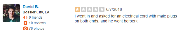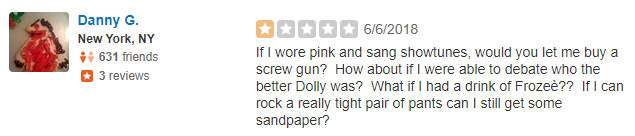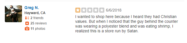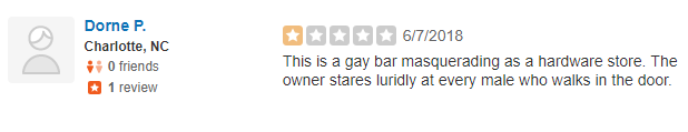 However, the goofy guy in Tennessee, who’s also a minister, decided it was a victory for discrimination and rehung his No Gays Allowed sign. This got his business trolled big time on Yelp. I screen capped a few of the more amusing reviews before Yelp moderators remove them. You can see those below.