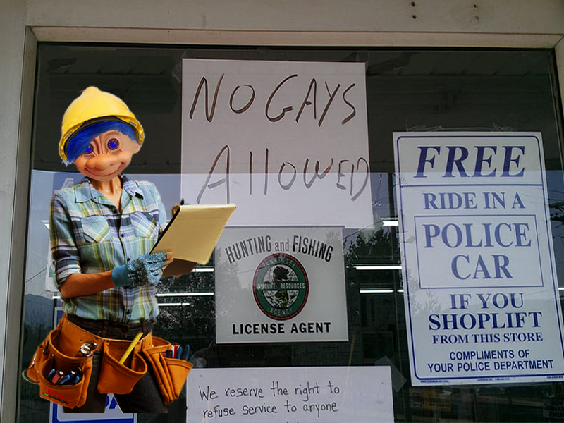 After the Supreme Court made its ruling on Gay marriage in 2015, a hardware store owner in Tennessee named Jeff Amyx hung a “Gays Not Allowed” sign in the window of his store. He did it again this year after the Supreme Court made its ruling on the Masterpiece Cakeshop because asshat.