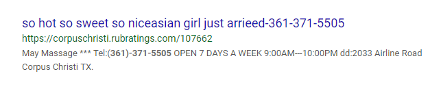 The ads were for different massage parlors in different states with different phone numbers. The only common denominator besides the Alex605917 email address, is that the ads featured Asian women. It looks like there’s a network of massage parlors engaging in prostitution and possibly human trafficking.This post is supporting data for the main Iron Troll article on human trafficking found here