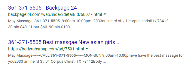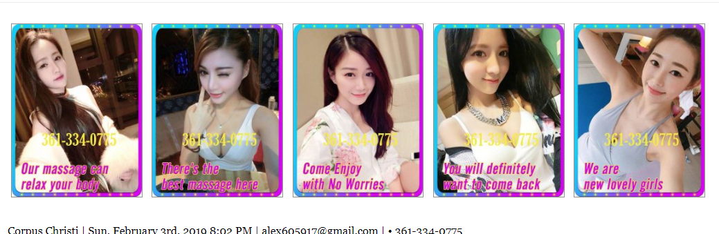 The phone numbers of Sun Massage and May Massage in Corpus Christi, Texas, are linked to an email address used to advertise massage services on CityXGuide.com, a website for escorts and adult services.
