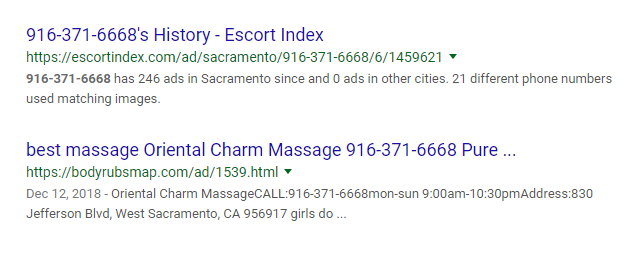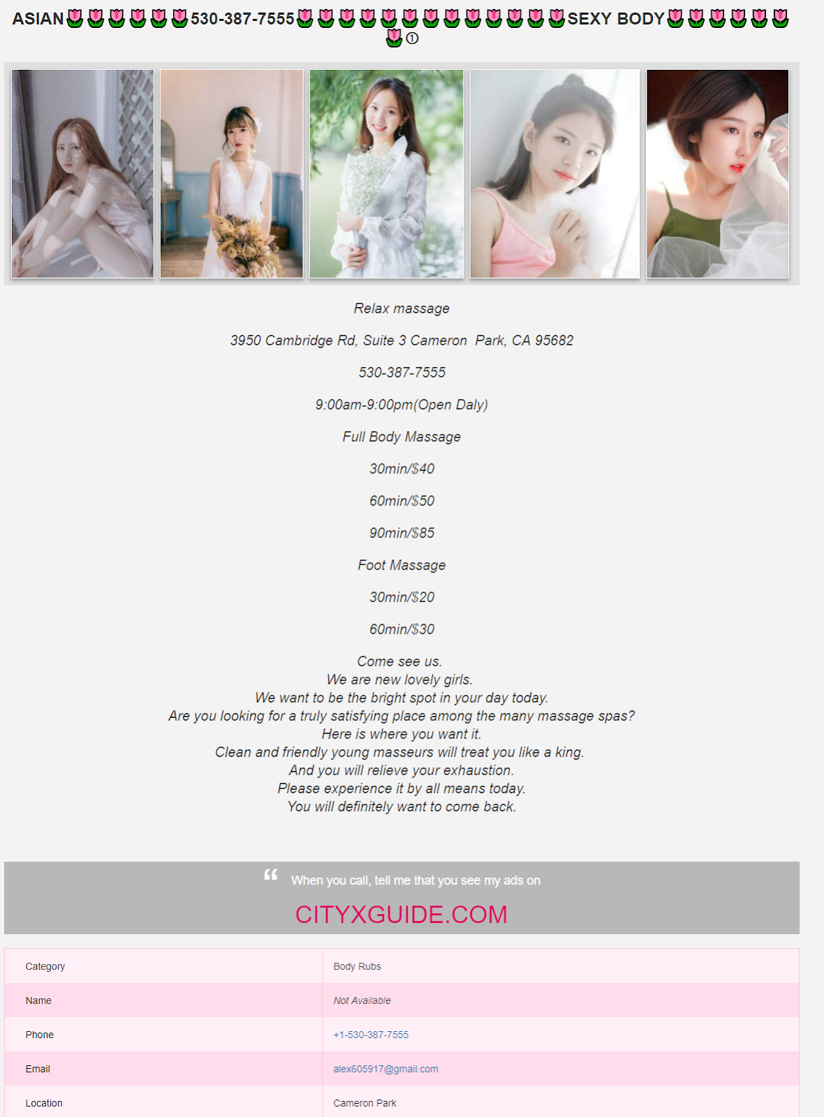 Oriental Charm Massage and Massage Avenue in West Sacramento, California are linked to an email address in advertisements for massage on CityXGuide.com, a website for escorts and adult services.