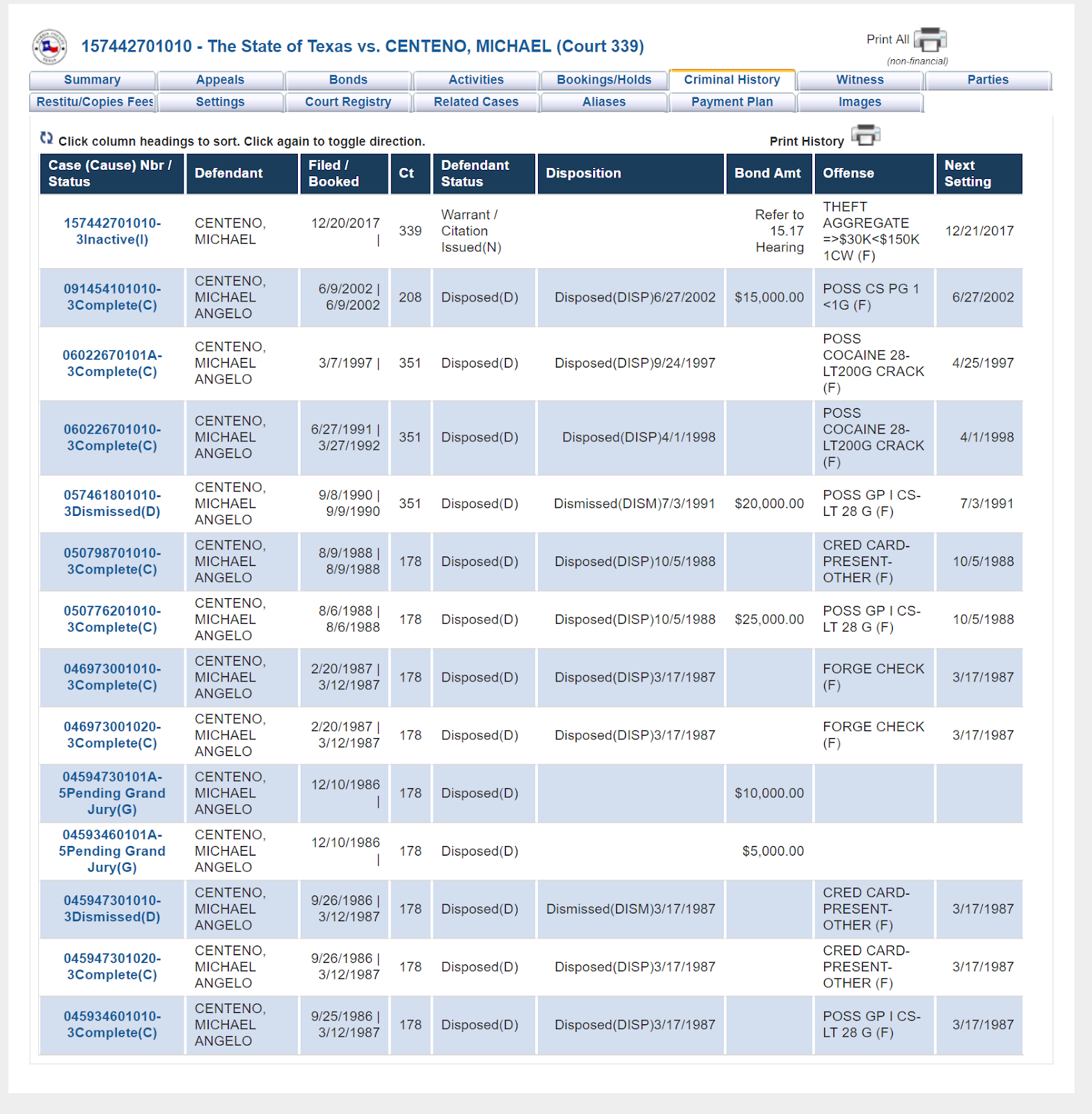 According to the police report, Dorrell and Centeno broke up in February of 2017 after a twenty year relationship that included marriage. After their break up, and over the course of several months, Centeno stole over $40,000 in jewelry and collectible coins from Dorrell and then pawned the stolen items to support his cocaine habit.