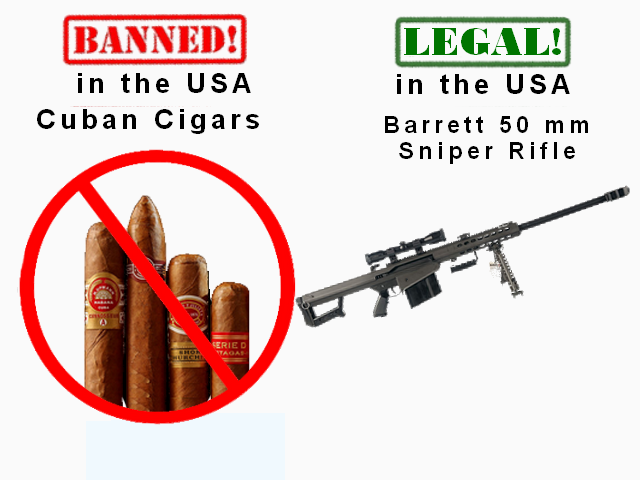 Cuban cigars can’t be sold in the US but you can buy a Barret 50 mm sniper rifle. It’s the perfect rifle for duck hunting! Get yourself some armor piercing, incendiary ammunition and you can blow those mallards out of the air and cook them at the same time!