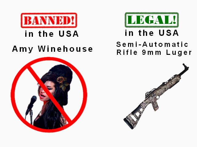 Before she passed away in 2011, Amy Winehouse was banned from the US because the American government frowns on celebrities who assault someone. But owning an assault rifle is totally okay.