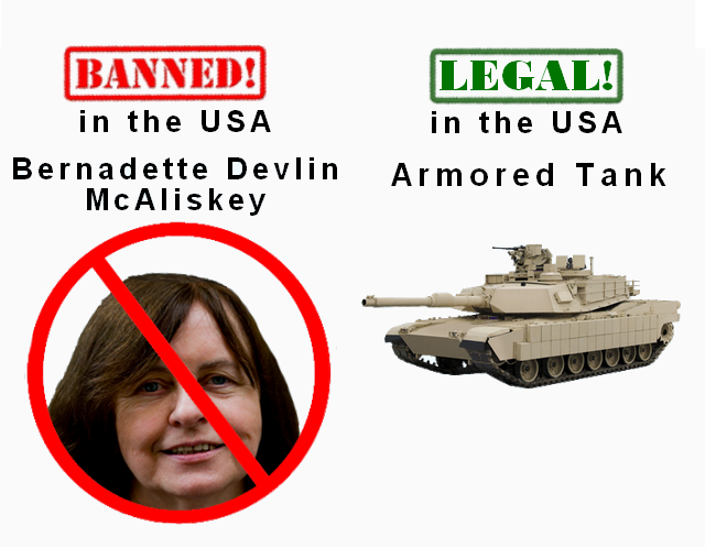 Irish citizen and activist, Bernadette Devlin McAliskey, is a former member of parliament and has been a civil rights leader for decades. During her career she’s made frequent visits to the United States and was awarded the Keys to the City of both New York and San Francisco. In 2003, at the age of 56, McAliskey was was banned from the US. The only reason given was that she posed a “serious threat to the security of the United States”. At the age of 70, she’s still banned.