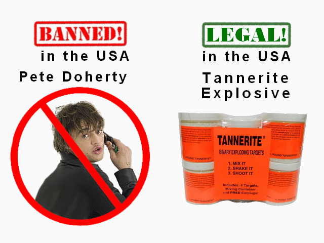 Another musician, Pete Doherty, is banned due to his overindulgence in illegal chemicals. In the US it’s legal to purchase the chemicals to make Tannerite. If you mix the 2 chemicals together and then shoot the mixture with a rifle or shotgun, you’ll get a nice explosion. The Vegas shooter had 50 pounds of Tannerite.