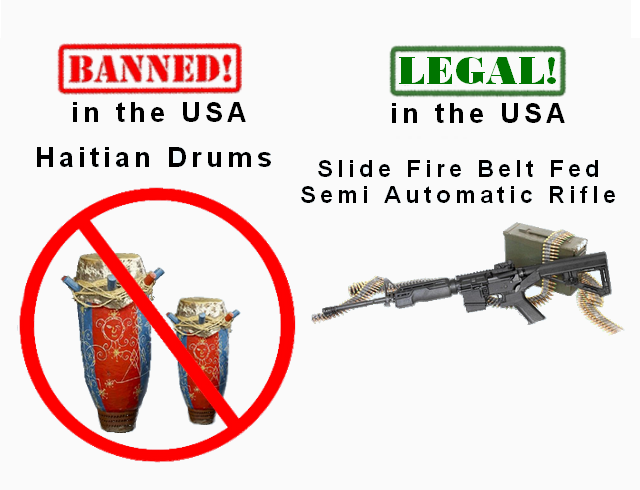 Tanbou are Haitian drums that use goat hide for the drum head. Tanbou aren’t legal in the US because there’s a slight possibility of catching anthrax. Because it happened once…43 years ago. Fortunately you can’t get anthrax from bullets so semi-automatic weapons are totally okay to purchase.