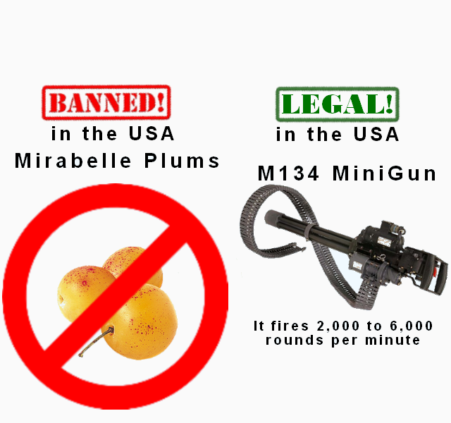For some secret reason we aren’t allowed to have Mirabelle Plums in the US but we can own a MiniGun which fires up to 6,000 rounds per minute. That’s 100 per second.