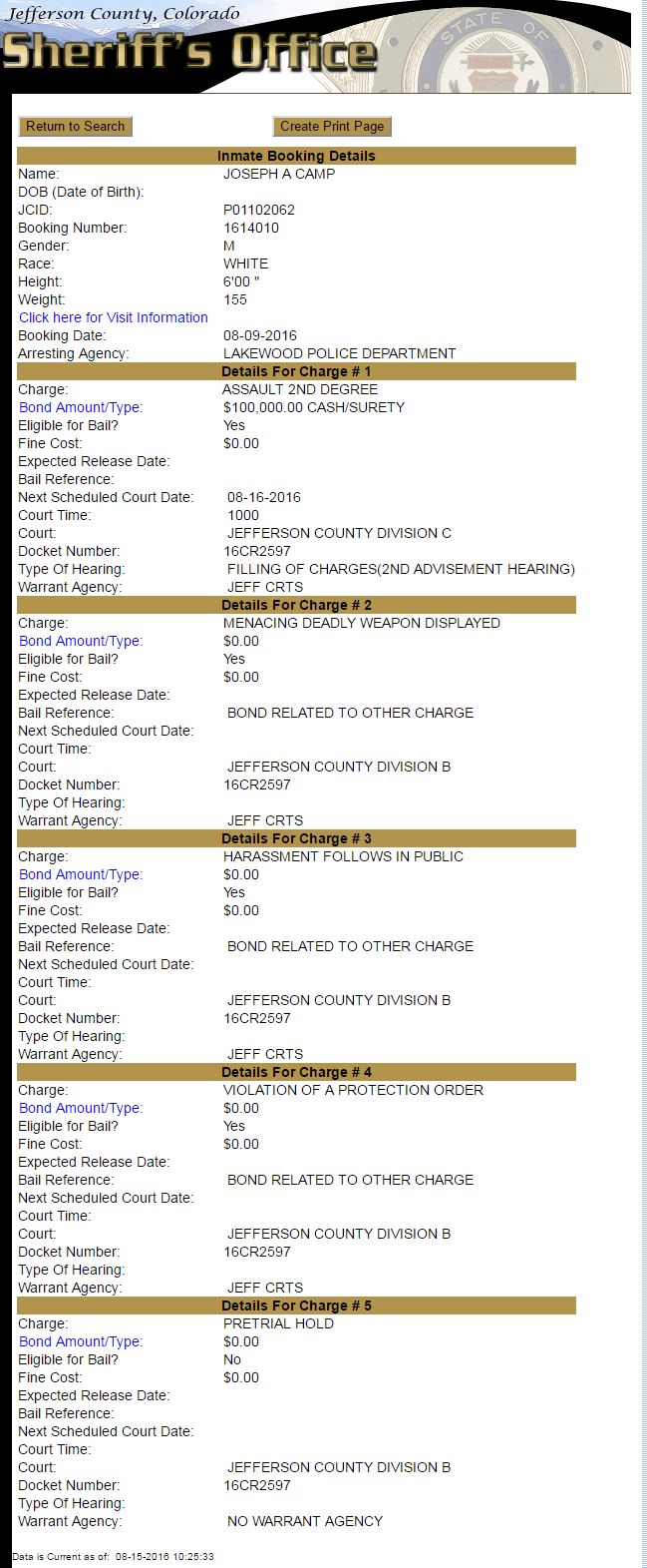 The booking details for Joseph Camp changed over the weekend, no doubt a result of his advisement hearing last week. The charge no longer showing is the “Attempt to influence a public official”, which is too bad, I was really interested in hearing more about that one.