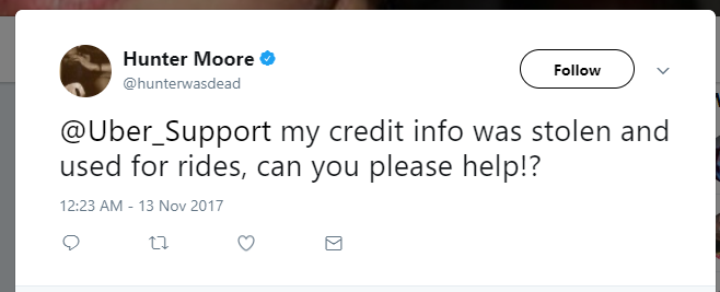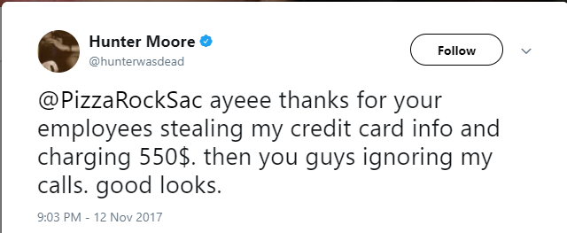Last night somebody used Hunter’s credit card info for an Uber ride and to buy $550 worth of pizza. Hunter was on Twitter Monday asking to get his money back.