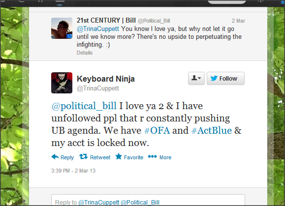 This conversation below is between Trina Cuppett and Connect The Left (CTL) member Bill Talley aka Political_Bill. It took place on March 2nd, 2013.