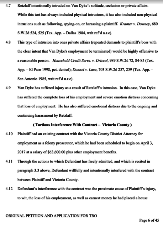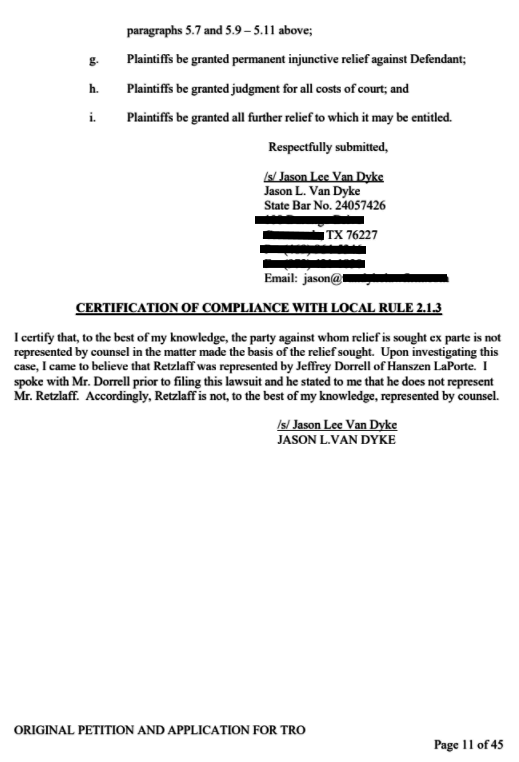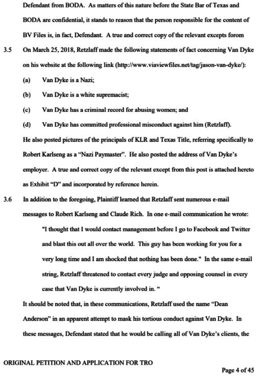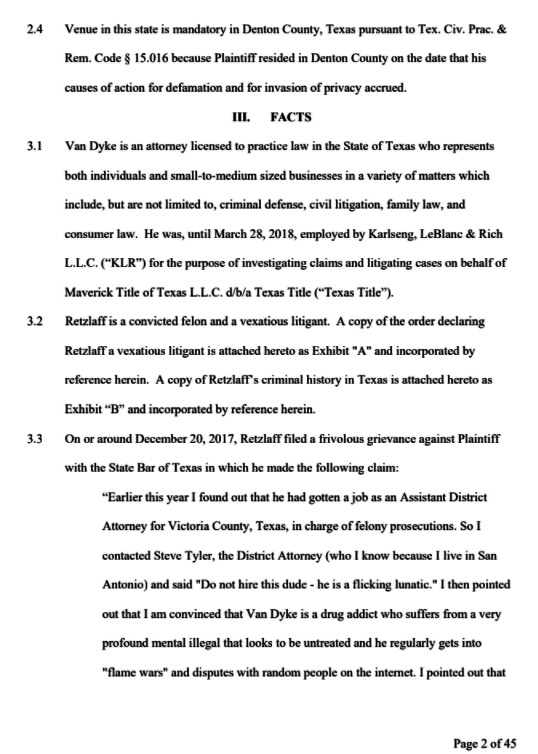 Retzlaff is declared a vexatious litigant in Texas which means he can’t file a lawsuit in the state of Texas without permission, so any counter suit he might wish to file against Van Dyke will have to be approved by the state of Texas, which is alleged to be conducting a Grand Jury investigation into Retzlaff’s activities in Texas.