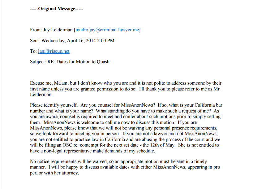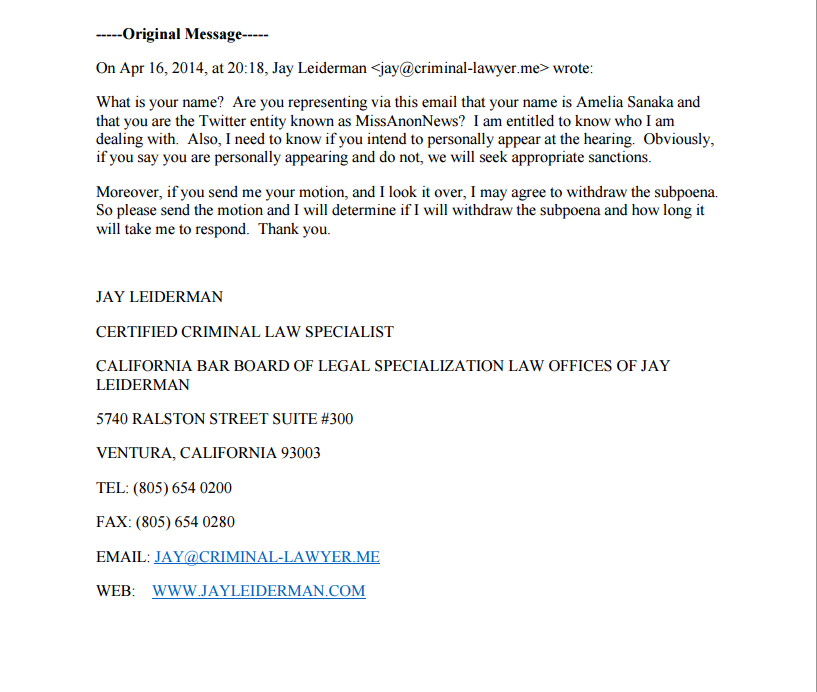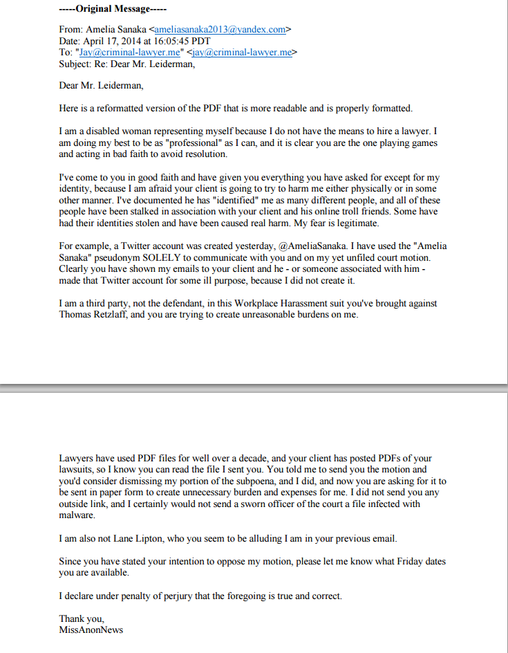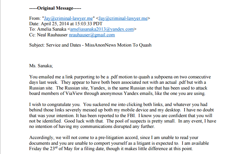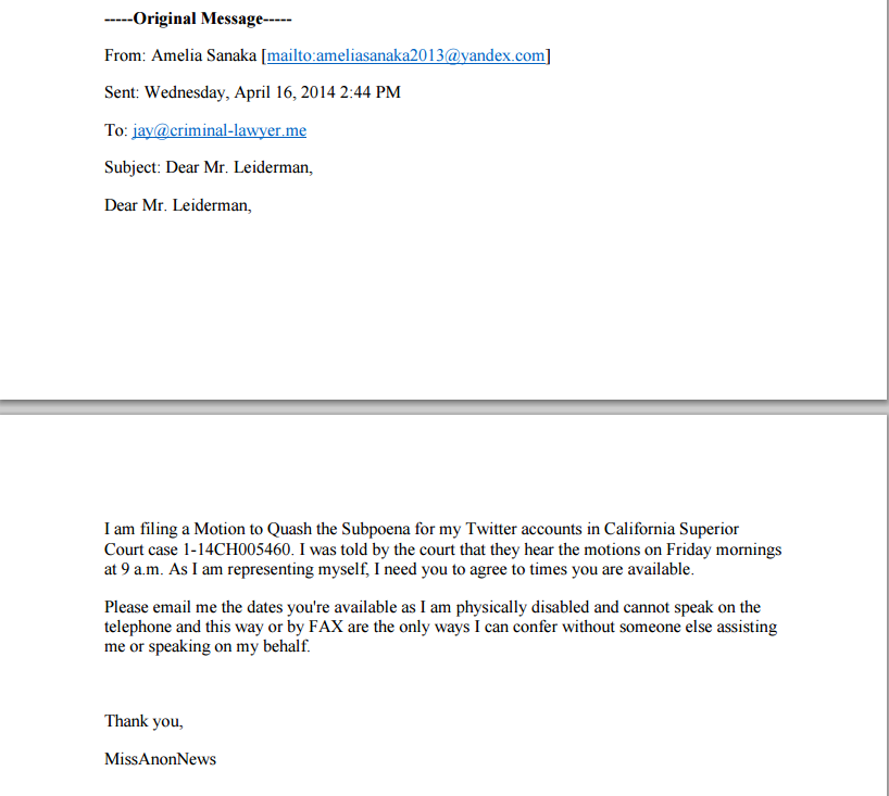 The judge ordered “Amelia” aka MissAnonNews to show up in court in person. But she couldn’t do that because she died. Neal said so.