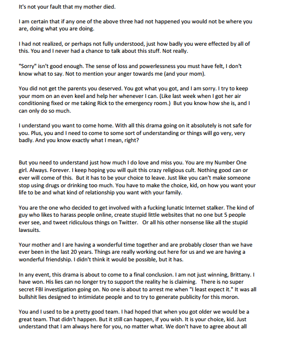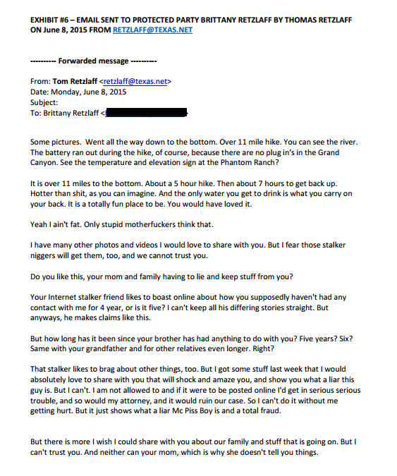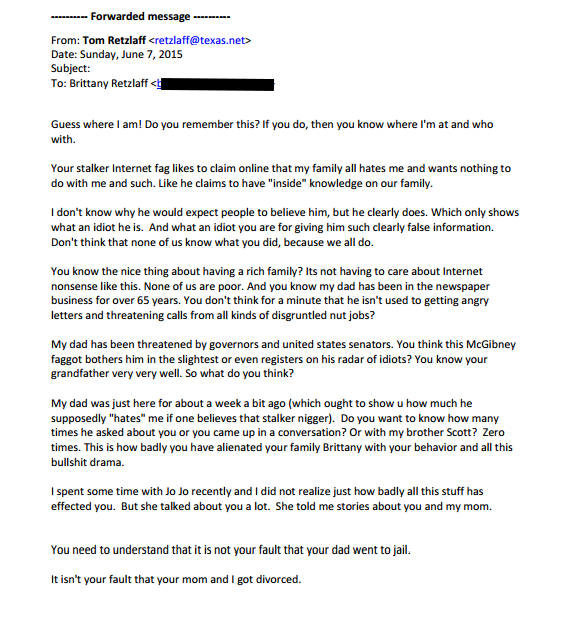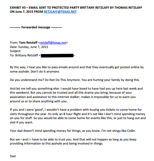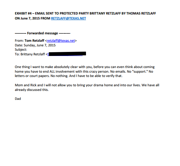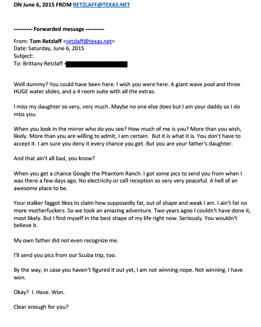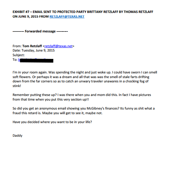 These are the latest emails from Thomas Retzlaff to his daughter in Peru. Tommy could be a master at emotional manipulation if he stuck to one method but in just 3 days worth of emails he uses too many tactics to try and get her to stop cooperating with McGibney and ViaView. Brittany has a restraining order against her father which he violates each time he sends an email. Despite his threats she continues to forward them to the legal department at ViaView. Getting desperate Tommy?