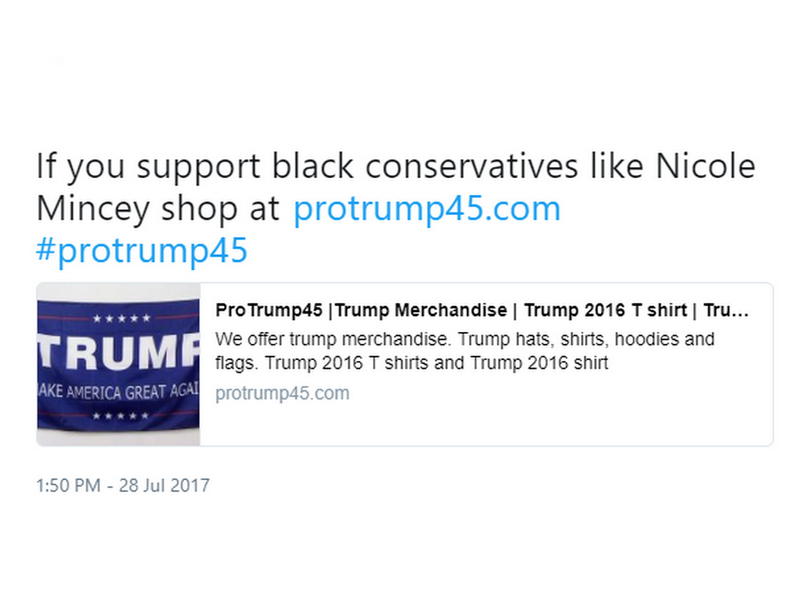 After Trump retweeted Nicole Mincey @protrump45, it didn’t take long for the Twitterverse to discover it was a fake account. A bot, and just one of many created to promote Trump and sell Trump merchandise.