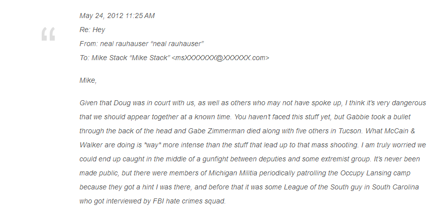 Neal loves to play spy! In this email Neal preys on Mike Stack’s paranoia while also inflating his own importance by claiming the “Michigan Militia” was at OccupyMichigan just to find him.