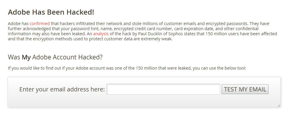 I was very very shocked! I hadn’t heard that Adobe was hacked and didn’t even remember having an Adobe account! According to LastPass someone, not me but allegedly a human, had used my email addess to verify that my account credentials were leaked. Golly!