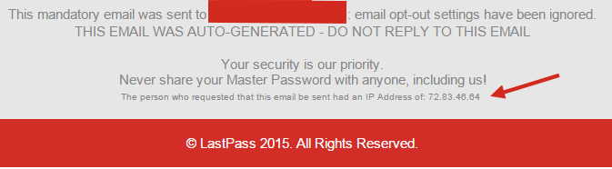 Fortunately LastPass captures the IP address of anyone who enters an email address on their site. And they include that IP address in their email alert in little tiny print at the very bottom.