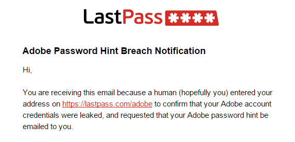I was ever so surprised to receive an email from a website called LastPass yesterday afternoon. LastPass was notifying me that my Adobe account was one of the millions leaked when Adobe was hacked last month.