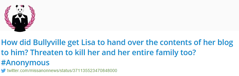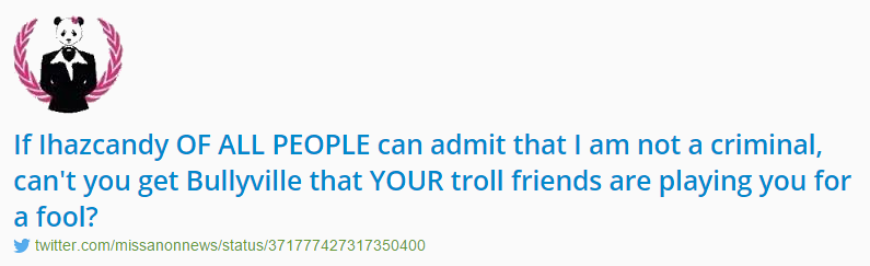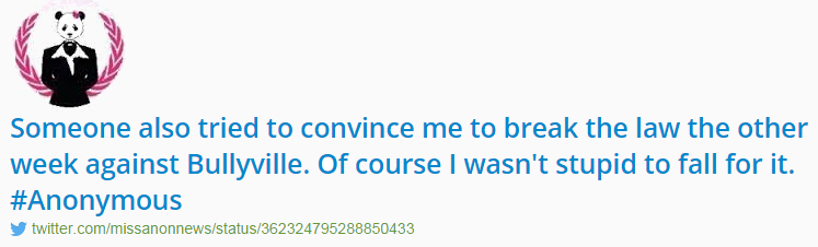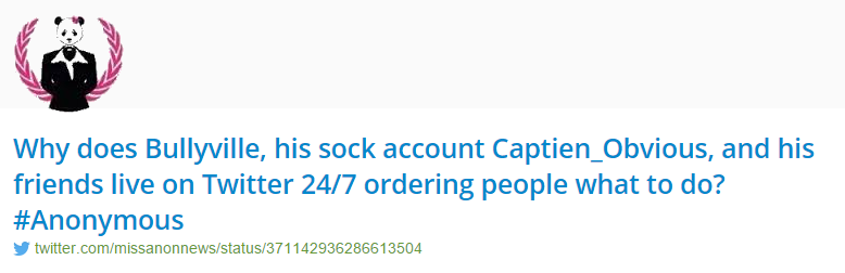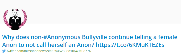 Alleged to have been run by several people, the MissAnonNews account claimed it was Anonymous before there was an Anonymous though she never took part in an op. Despite her name, MissAnonNews rarely gave anon news…she wasn’t much of a lady either.