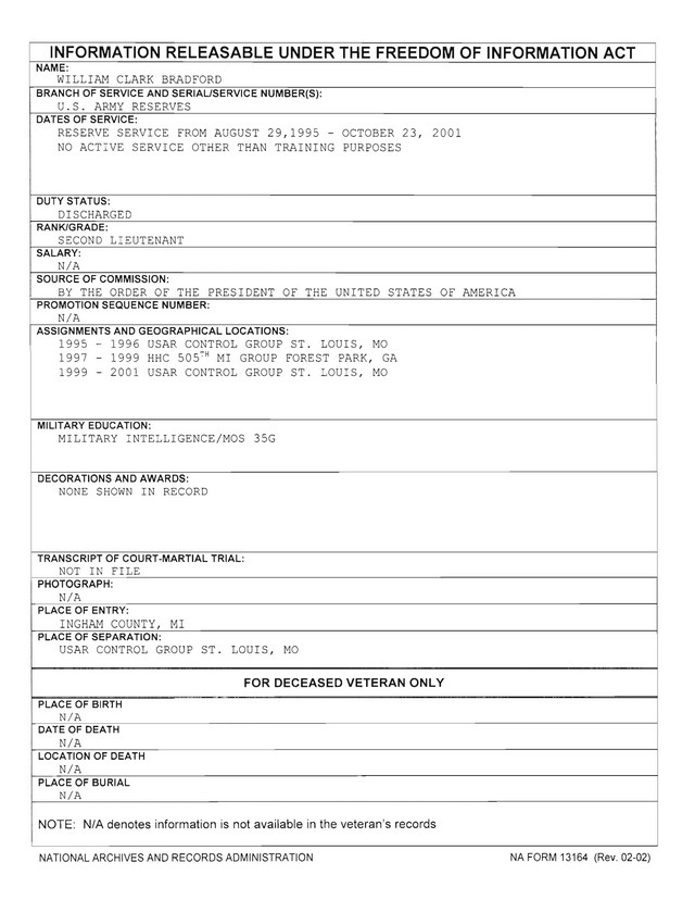 Bradford got busted. There were only a small number of soldiers awarded the Silver Star during the first Gulf war and Bradford wasn’t one of them. You’ll see in the FOIA below that Bradford didn’t join the military until 1995, 4 years after Desert Storm. And what he joined was the Army Reserves. He was never in any action, was never overseas and was never promoted above second lieutenant.