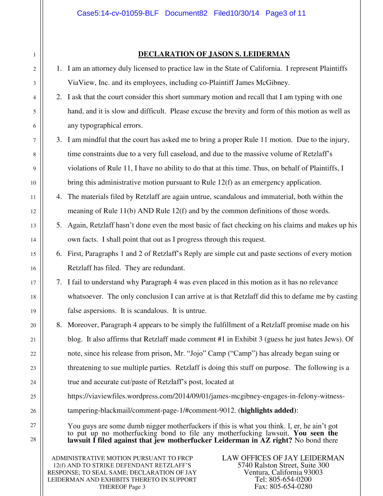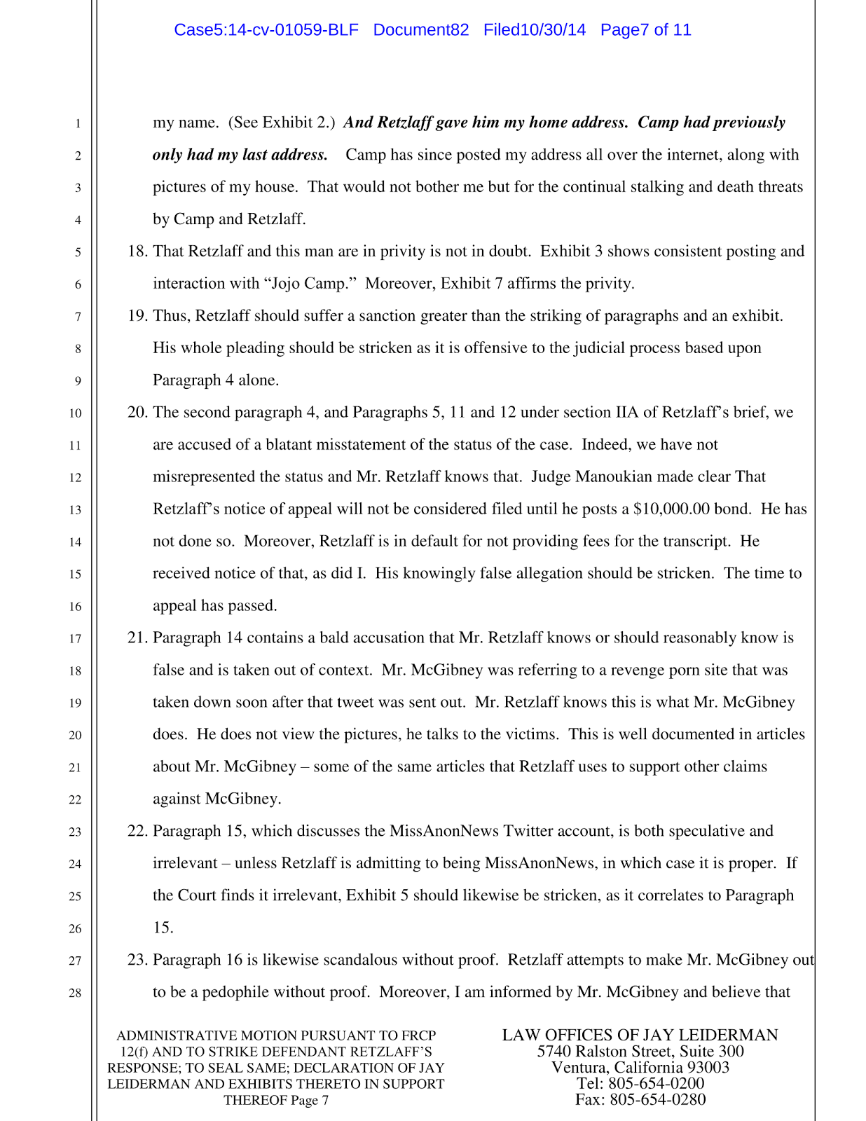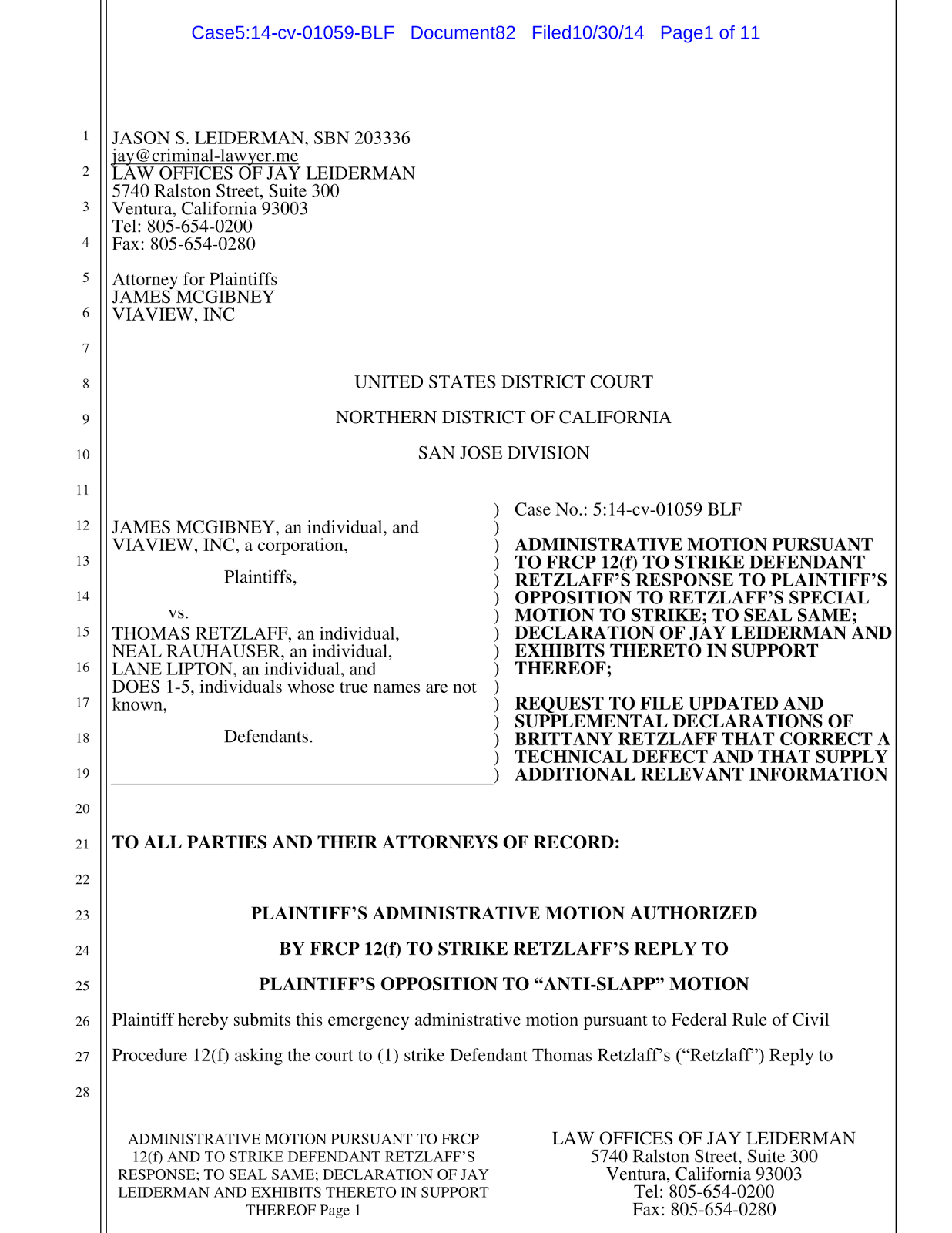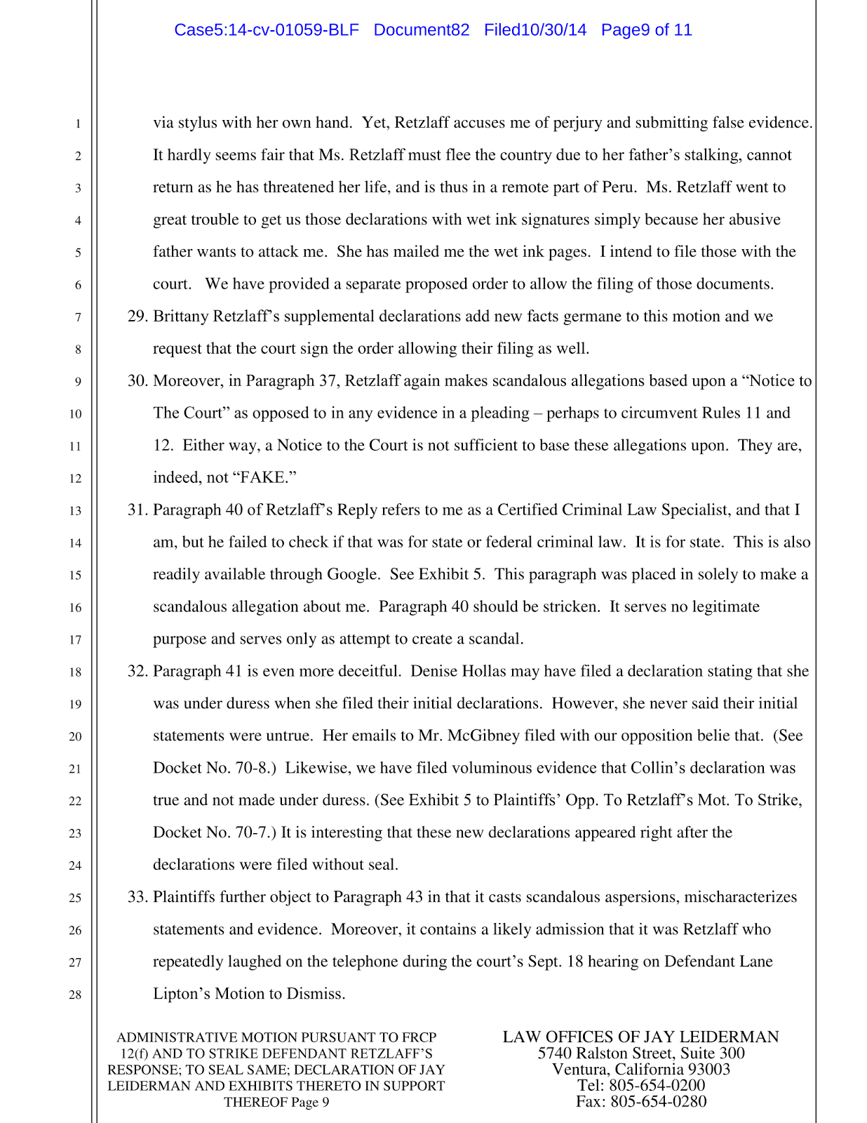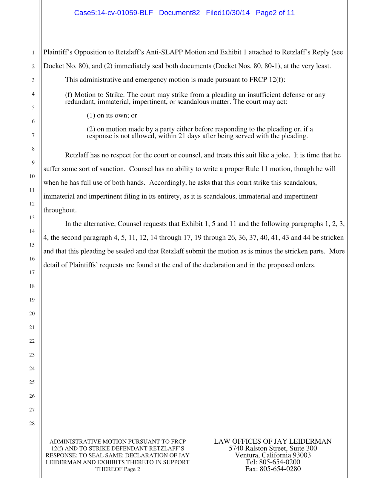 Thomas Retzlaff has been filing frivolous motions in an attempt to prolong the lawsuit, his latest was a motion to strike and have the court records sealed.. This is Leiderman’s motion to strike the strike.