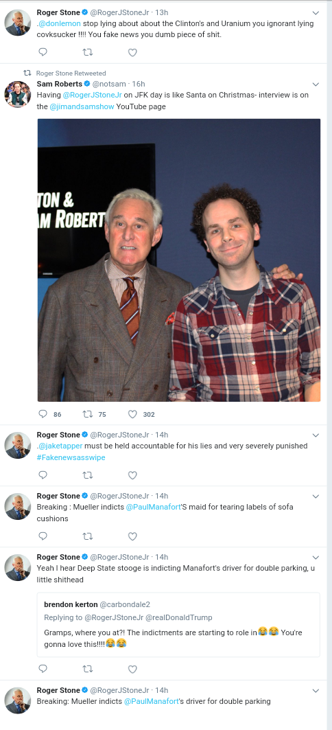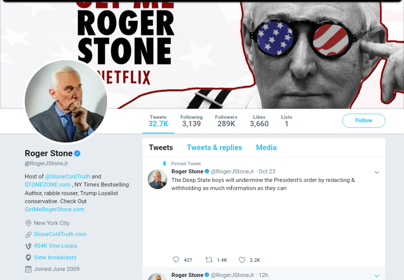 Twitter has been one of Stone’s major tools for communication and promotion, so I expect he’ll create a new account soon.