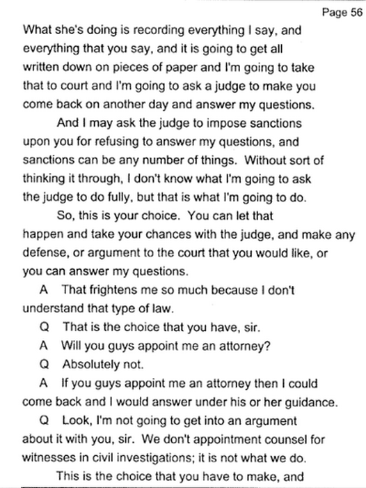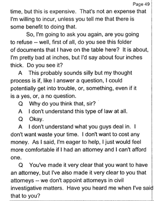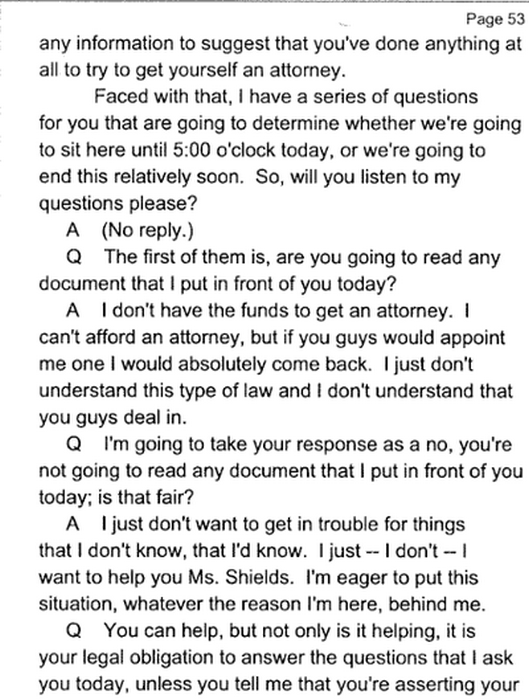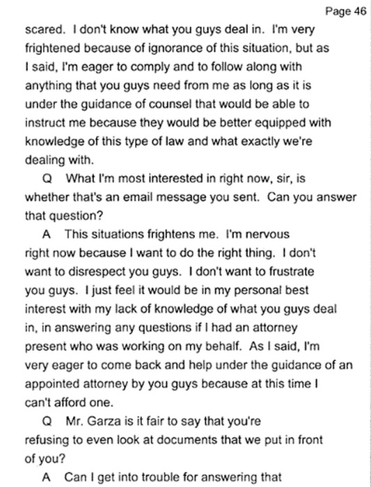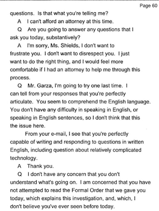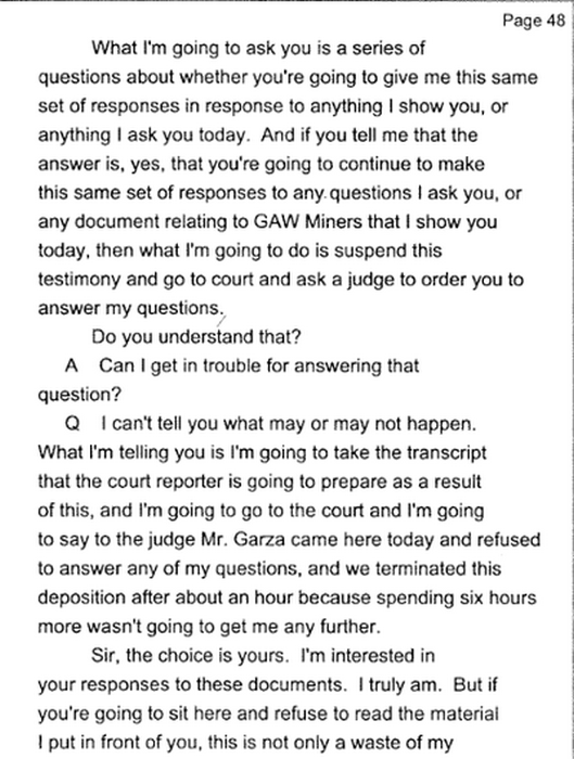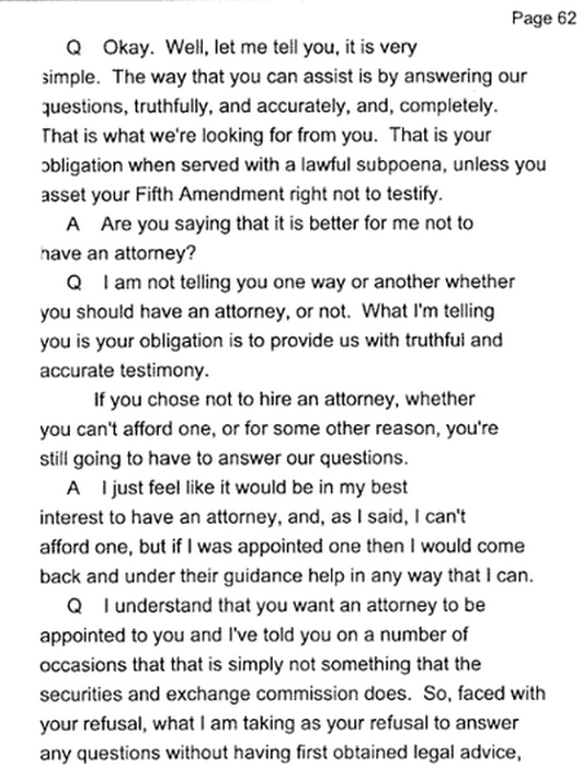 That’s how you DON’T want to behave when called before the Securites and Exchange Commission. Whoever told Carlos Garza to not cooperate gave some very bad advice. Garza was clearly informed he had two choices in complying with the SEC: either answer the questions or plead the 5th-as in the 5th Amendment where you refuse to answer to avoid incriminating yourself. Carlos chose an imaginary third option he kept parroting: