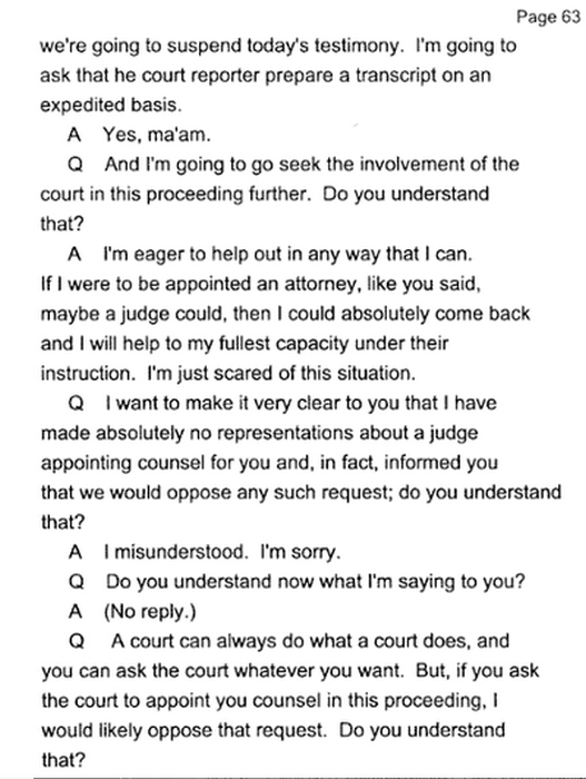“I am extremely frightened. I don’t understand this type of law at all. I’m more than willing to help but I want a lawyer and I can’t afford one.”