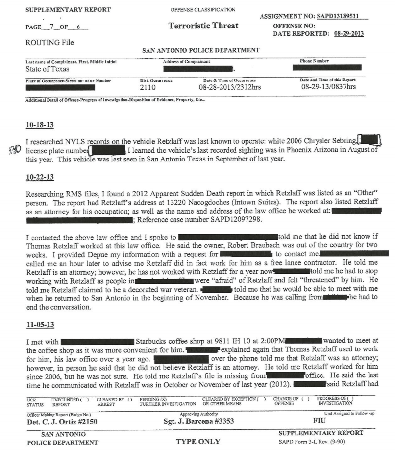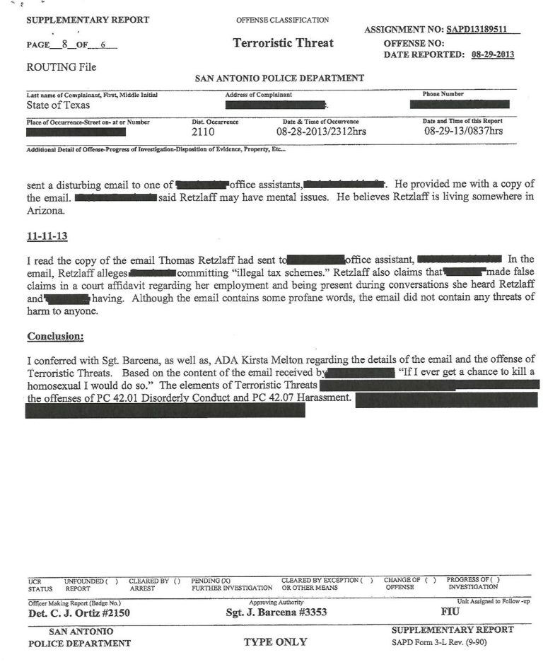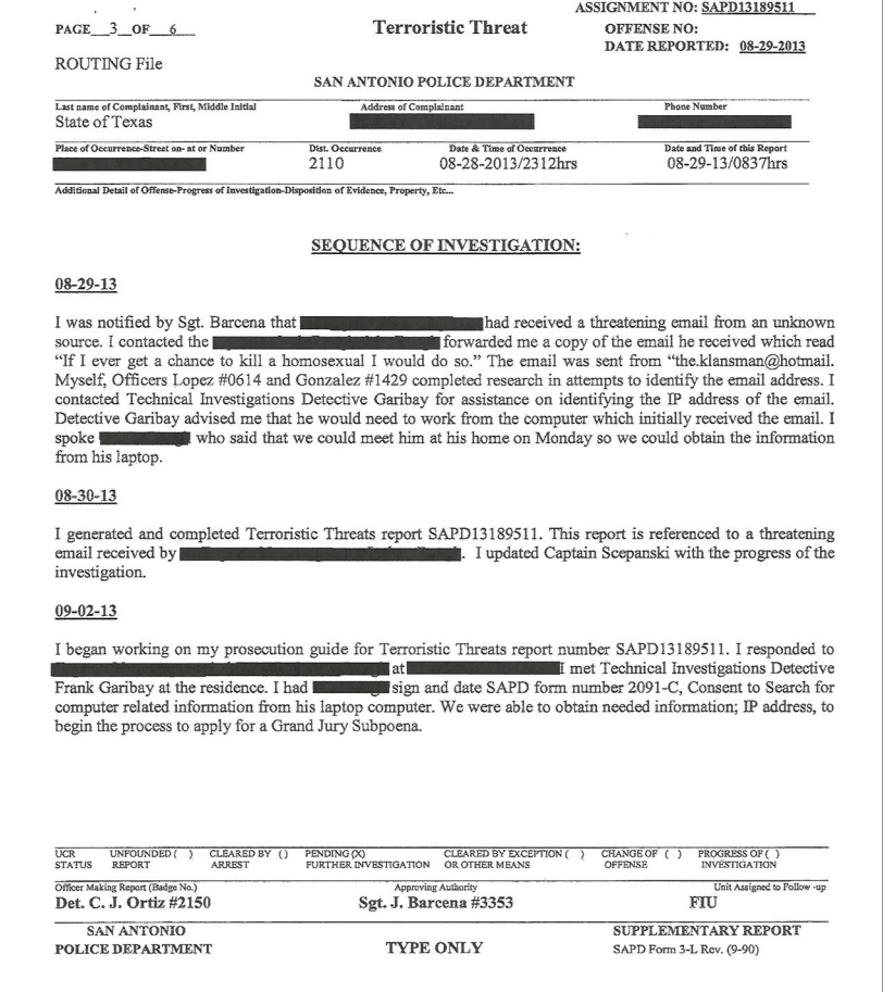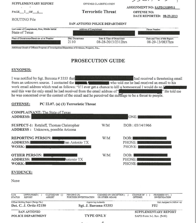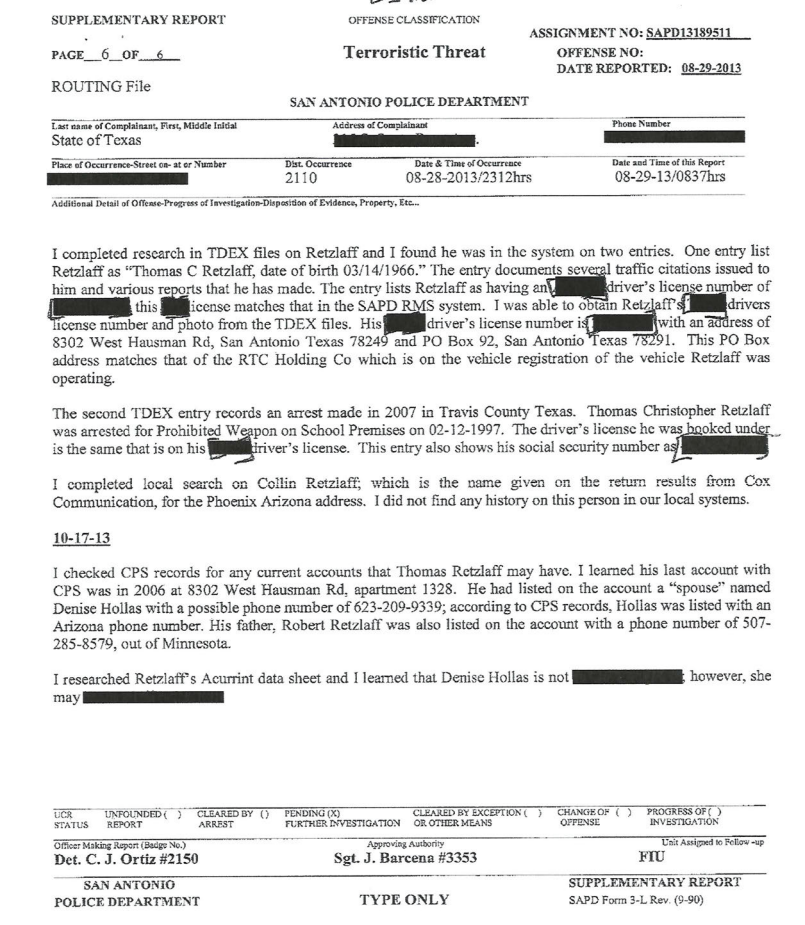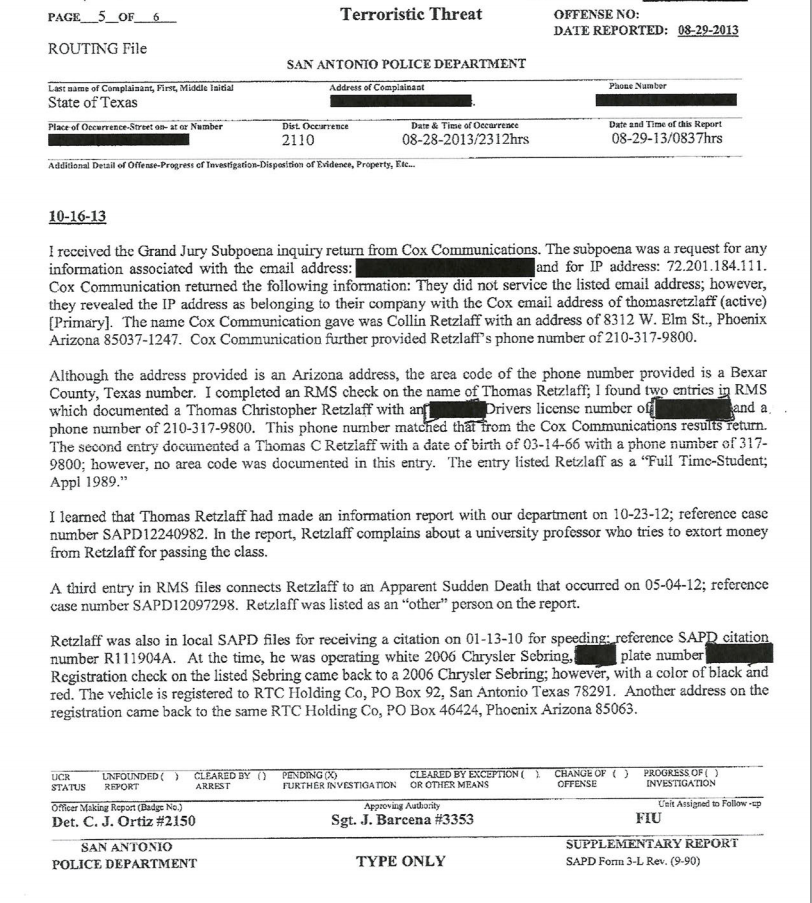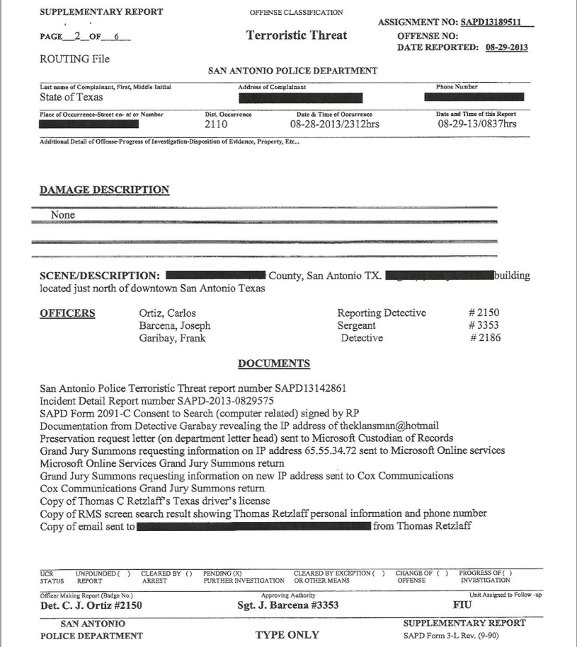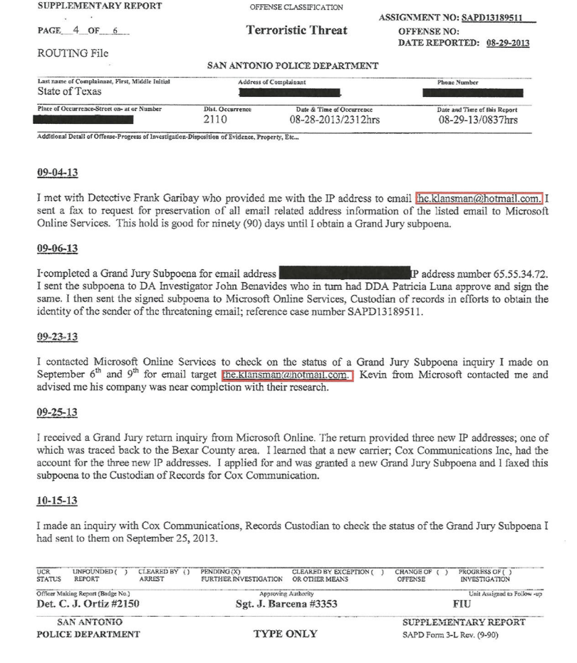 This is the 2013 report by the San Antonio police investigating a threat made via email. The report provided further proof via the results from a Grand Jury Subpoena that Thomas Retzlaff owned the email account theklansman@hotmail.com.