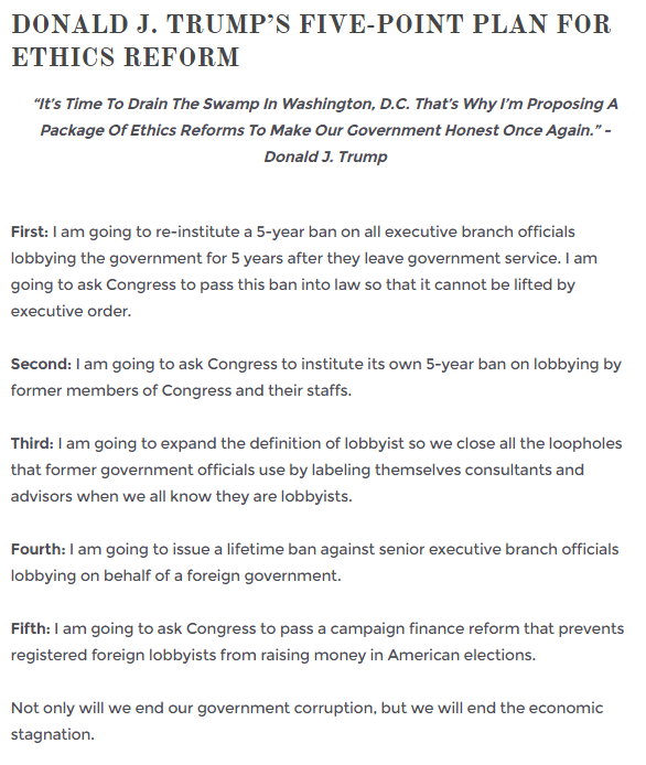 Trump claims to be an outsider, clearly he’s no diplomat but he seems to be pretty good at reneging on his campaign promises and quite skilled at cronyism