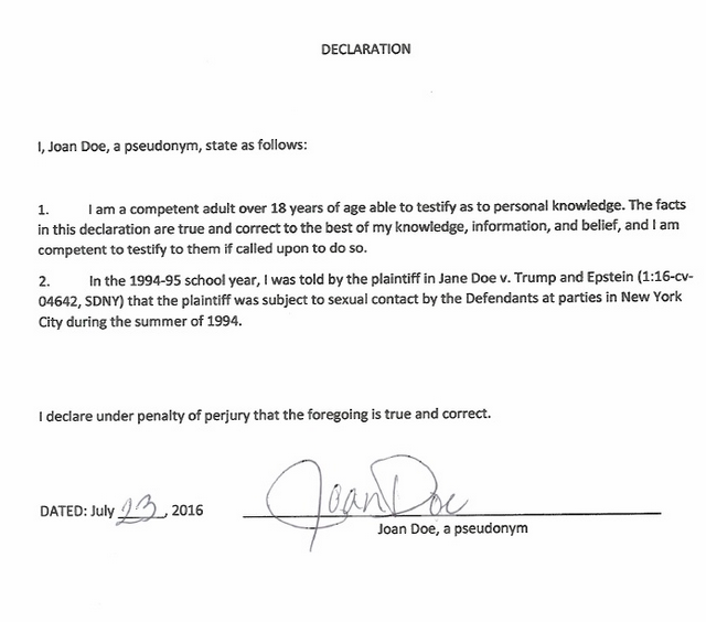 The amended complaint is below, following that is the affidavit from the new witness. You’ll also notice a new lawyer has joined the case. Katie Johnson, aka Jane Doe, remains in hiding.