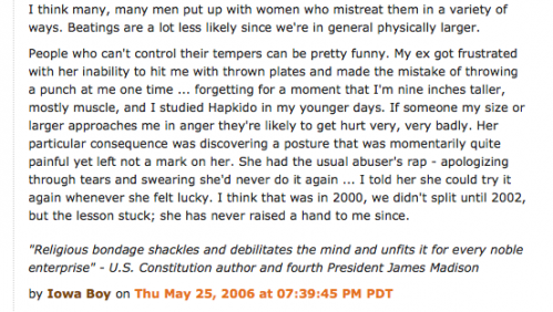 And secondly, that sanction impinges upon McGibney’s right to free speech. There’s a Daily Kos story where Neal, writing as Iowa Boy, boasts about physically subduing his wife using a martial art called HapKiDo. McGibney is aware of that story and has been in regular communication with Neal’s ex wife. On his knowledge and belief, if McGibney considers Neal a wife beater then it’s his 1st amendment right to express that opinion.