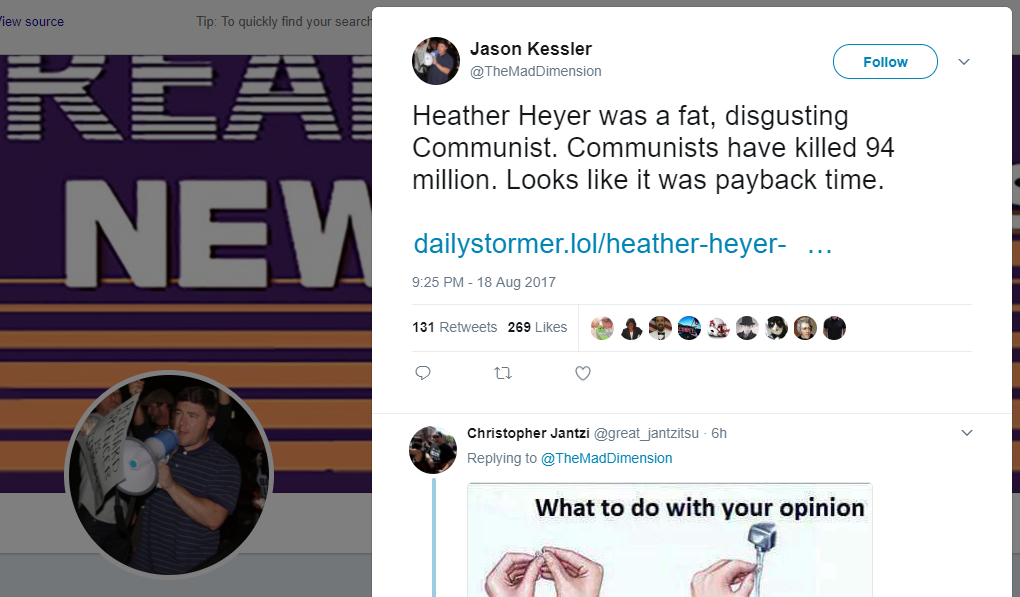 And so on Friday night, a nasty tweet about Heather Heyer was sent from @TheMadDimension, the Twitter account of Jason Kessler, organizer of the Charlottesville Unite The Right rally.