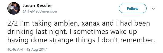 Jason claimed amnesia and blamed the tweet, if he made it, to be the result of a combination of Xanax, Ambien, and alcohol.