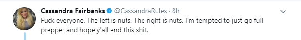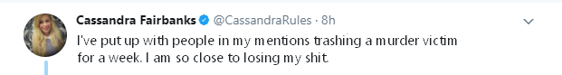 Naturally Cassandra Fairbanks was upset about the tweet because Cass is morally superior to everyone on Twitter.