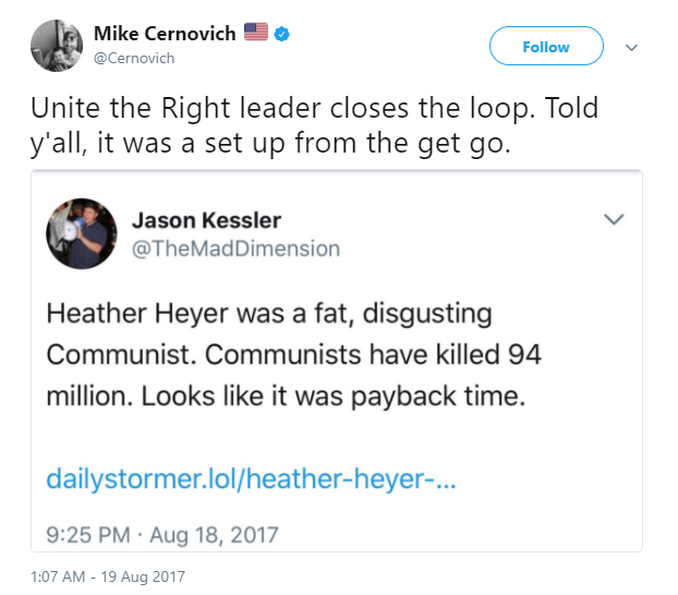 Of course Mike Cernovich had a conspiracy theory ready. the Unite The Right rally in Charlottesville was a Federal false flag event and the tweet was proof.